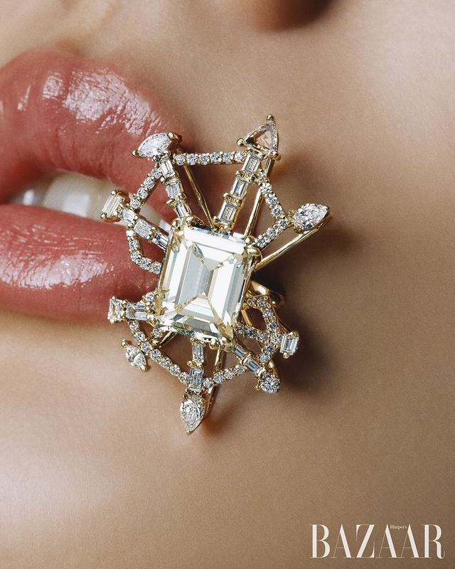 4캐럿의 에메랄드 컷 다이아몬드가 돋보이는 반지는 Tana Chung.