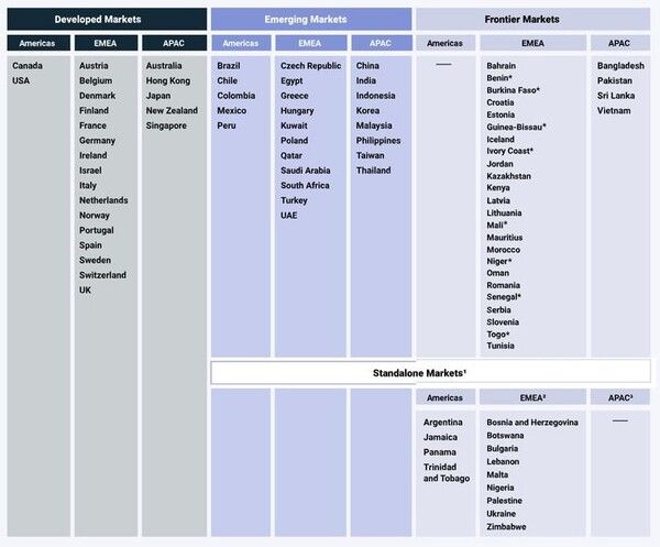 MSCI는 매년 전 세계 주요 증시를 선진시장(DM), 신흥시장(EM), 프론티어시장(FM), 독립시장으로 분류하고 있습니다. 선진시장에는 총 23개국, 신흥시장에는 우리나라를 포함해 총 24개국, 프론티어시장에는 총 28개국이 속해 있습니다. 우리나라는 지난 1992년 신흥시장에 편입됐고 2009년 선진시장 편입 관찰대상국에 올랐다가 2014년 관찰대상국에서 제외됐습니다.