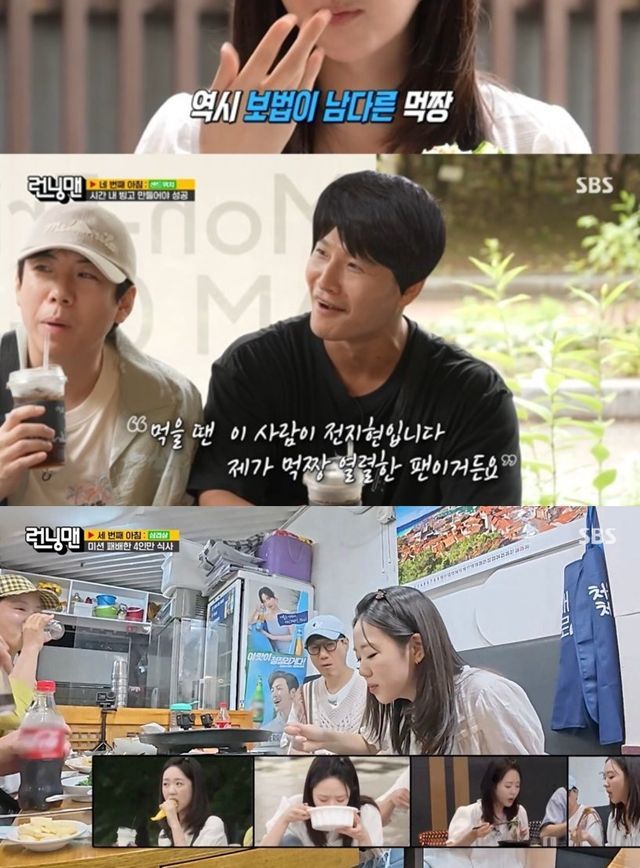 지예은은 제작진의 ‘타임 어택’ 압박에도 “삼겹살엔 된장찌개 필수”라며 숟가락을 놓치 않았고 “떡볶이까지 있는데 먹어줘야 예의”라고 덧붙여 모두를 포복절도하게 됐다. 함께 있던 송지효는 “쟤는 못 이기겠다”고 혀를 내둘렀다. 네 번째 식사 샌드위치, 다섯 번째 식사 순댓국에도 지예은은 식사를 멈추지 않았고 김종국은 “먹을 때는 전지현”이라고 치켜세웠다.