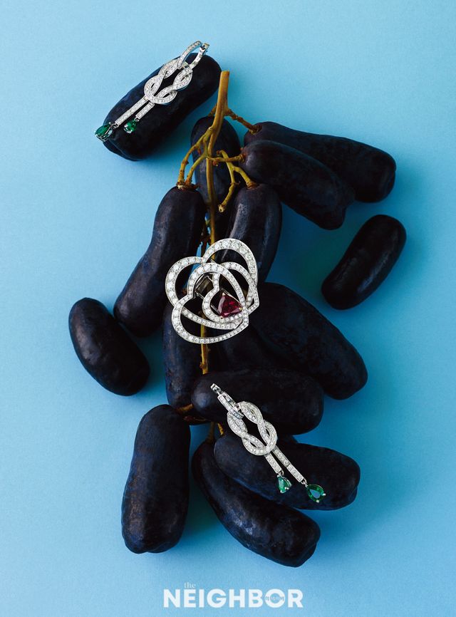 Fred 화이트 골드에 에메랄드와 다이아몬드를 세팅한 샹스 인피니 이어링, 루벨라이트를 세팅한 핑크 골드, 다이아몬드를 파베 세팅한 화이트 골드로 이루어진 프리티 우먼 글래머러스 브로치 모두 가격 미정.