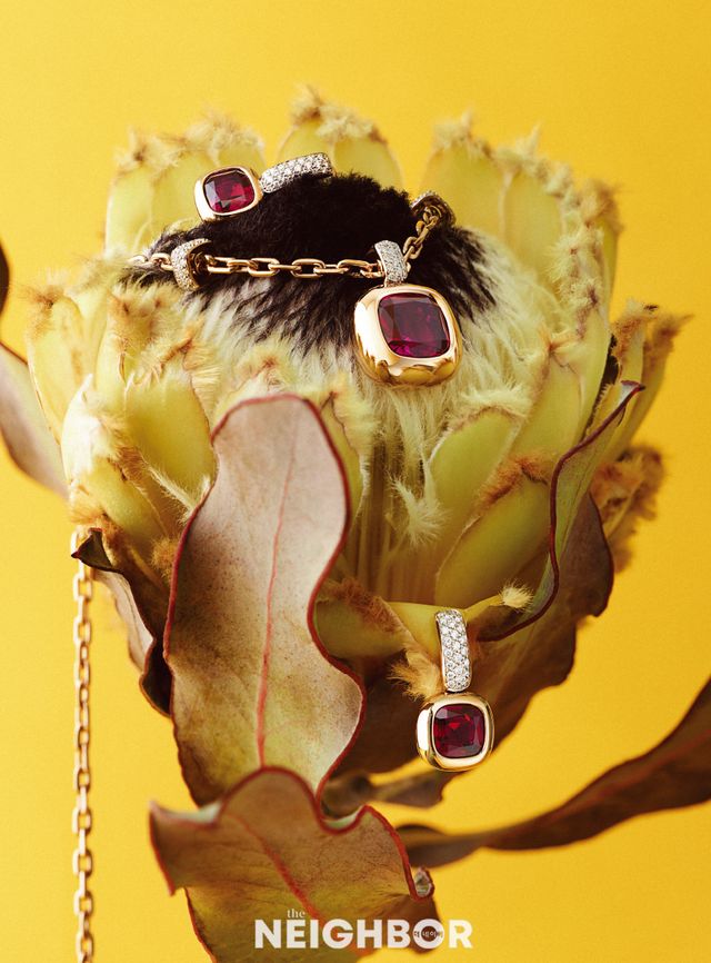 Pomellato 메종의 고유한 누도 커팅 방식을 활용해 원석 본연의 색이 돋보이는 총 6캐럿의 루벨라이트 2개, 총 50개의 다이아몬드를 장식한 로즈 골드 베젤 조합의 누도 하이 주얼리 컬렉션 이어링, 10.50캐럿 루벨라이트 펜던트에 다이아몬드 238개를 세팅한 골드 체인을 연결한 로즈 골드 누도 하이 주얼리 컬렉션 네크리스 모두 가격 미정.