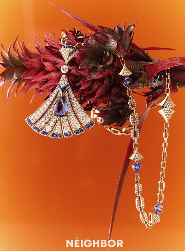 Bvlgari 5.48캐럿의 카보숑 탄자나이트를 센터 스톤으로, 총 7.74캐럿의 탄자나이트 비드, 0.52캐럿의 라운드 다이아몬드, 총 2.12캐럿의 버프 톱 사파이어, 그리고 5.14캐럿의 다이아몬드를 파베 세팅한 로즈 골드 소재의 디바스 드림 하이 주얼리 네크리스 가격 미정.