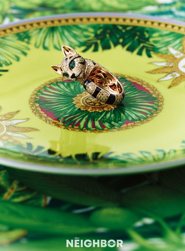 Boucheron 80개의 다이아몬드, 401개의 샴페인 라운드 다이아몬드, 그리고 두 개의 에메랄드로 귀여운 고양이를 형상화한 핑크 골드 소재 퍼지, 레오파드 캣 링 6천만원대.