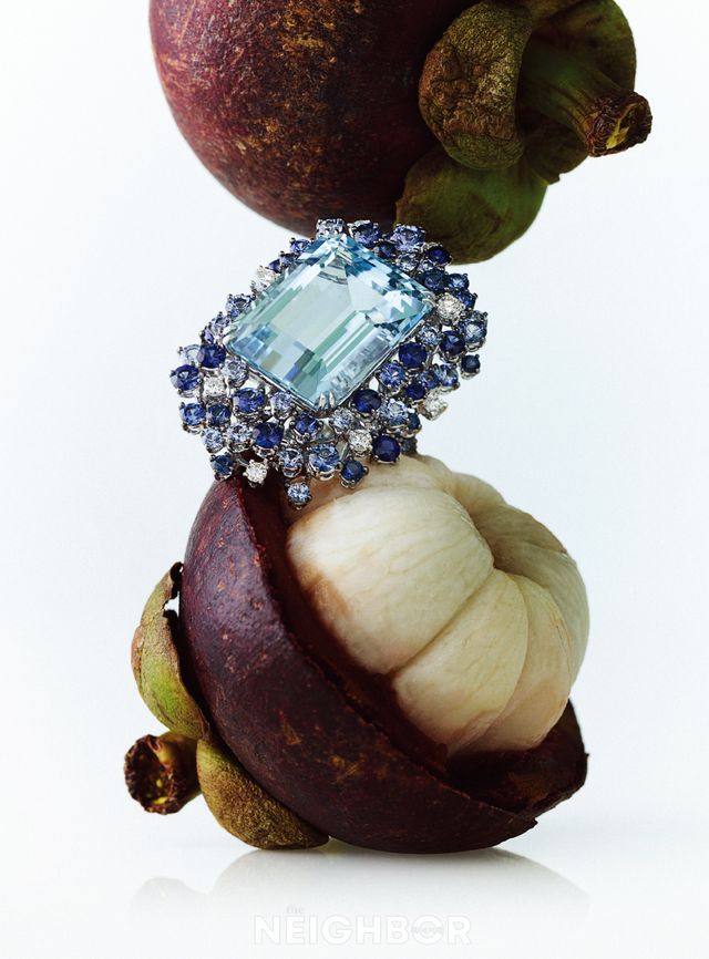Damiani 6.9캐럿의 아쿠아마린을 센터 스톤으로 총 0.71캐럿의 사파이어와 다이아몬드를 섬세하게 두른 미모사 링 가격 미정.