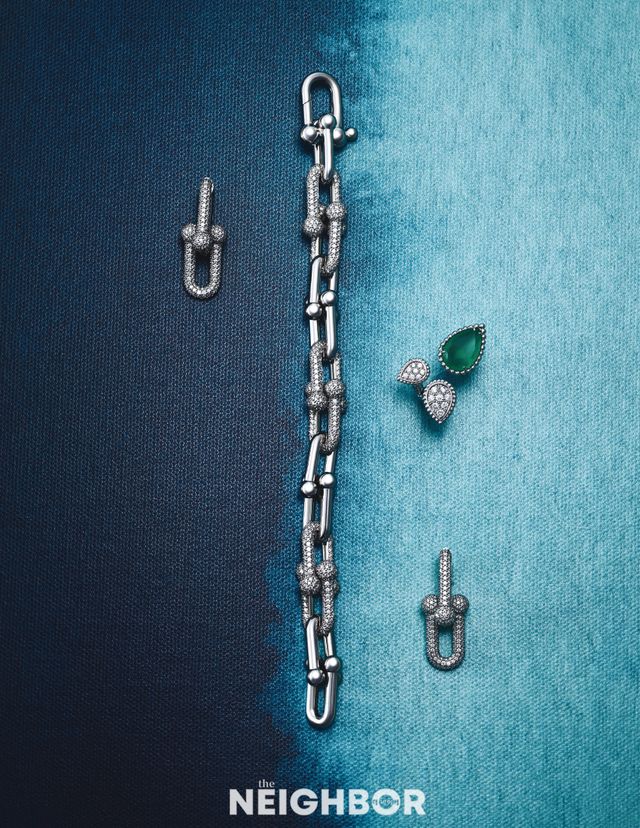 Tiffany&Co. 다이아몬드를 파베 세팅한 링크와 솔리드 화이트 골드 링크를 교차한 티파니 하드웨어 링크 브레이슬릿, 화이트 골드 전면에 다이아몬드를 파베 세팅한 티파니 하드웨어 링크 이어링 모두 가격 미정.