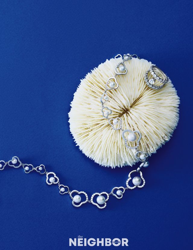 Tasaki 꽃의 실루엣에서 영감 받은 크고 작은 모티프 위로 아코야 진주와 다이아몬드를 섬세하게 세팅한 찬트 다이아몬드 파베 화이트 골드 네크리스, 식충 식물의 위협적인 모습을 다이아몬드로 아름답게 표현한 데인저 링 모두 가격 미정.