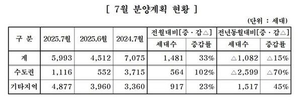 이는 전월(4512가구) 대비 1481가구(33%) 늘어난 물량으로, 전년 동월(7075가구)과 비교해서는 1082가구(15%) 감소한 수치다.