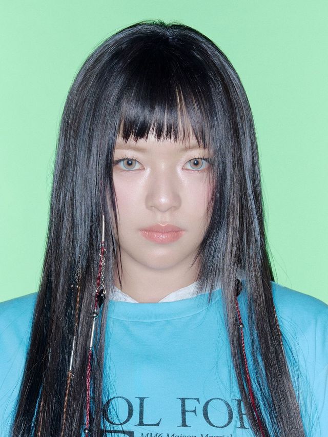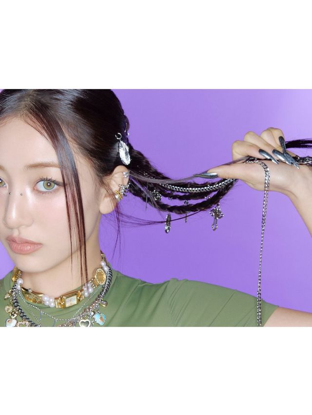 정연이 입에 살짝 물고 있는 건 다름 아닌 헤어 피스. 검은 머리와 대비되는 버건디 피스에 실버 액세서리를 더해 현대적인 에스닉 무드를 연출했습니다. 지효는 쇠목걸이를 연상시키는 실버 장식을 붙여 과감하고 강렬한 아이돌 스타일링을 완성했죠.