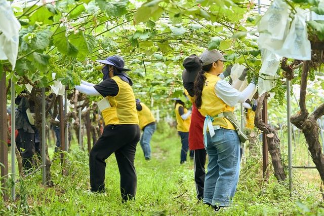 지난 26일 인스파이어 임직원 봉사단이 인천 옹진군 신도 포도농가에서 일손을 돕고 있다. ⓒ 인스파이어 엔터테인먼트 리조트