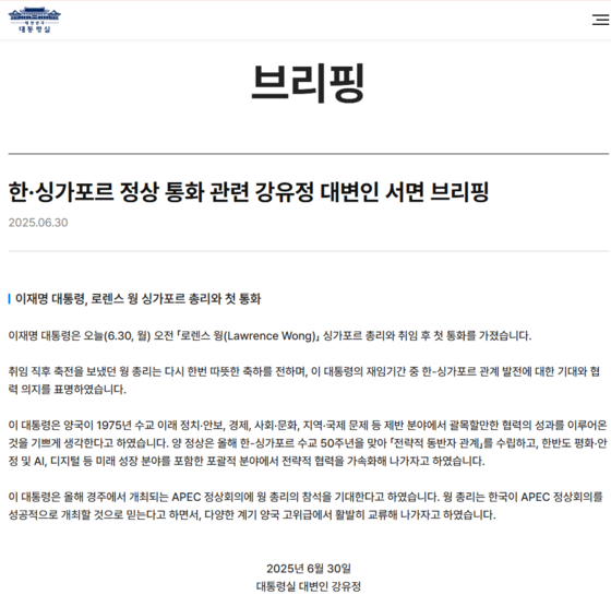 이재명 대통령은 30일 오전 11시에 로렌스 웡(Lawrence Wong) 싱가포르 총리와 취임 후 첫 통화를 가졌다고 강유정 대통령실 대변인이 서면브리핑에서 밝혔다.