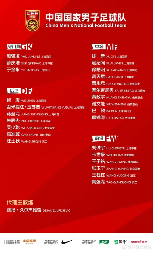 중국축구협회(CFA)는 30일(한국시간) 오는 7월7일부터 16일까지 한국에서 개최되는 2025 동아시안컵에 출전할 26명의 선수 명단을 발표했다.