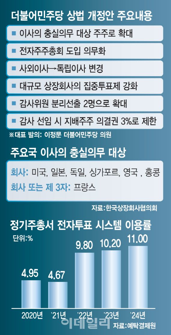 아울러 전자 주총 의무화 역시 기업 입장에서 상당한 비용과 시간이 필요한 문제다. 상법 개정안은 자산 2조원 이상의 상장사는 전자 주총을 의무화했다. 시행 시기는 법 공포 후 1년 이후로 명시했으나 1년 만에 상장사들이 원활하게 전자 주총 준비를 완료하기엔 부담이 크다. 현재 정기주총에서 한국예탁원 전자투표 시스템 이용률은 지난해 11%에 불과하다. 전자 주총이 도입되더라도 실제 주주들의 참여가 늘어날 것이라고 예측하기 어렵다.
