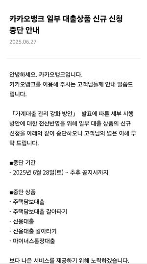 | 카카오뱅크의 일부 대출상품 신규 신청 중단 안내문. [카카오뱅크 앱 캡처] |