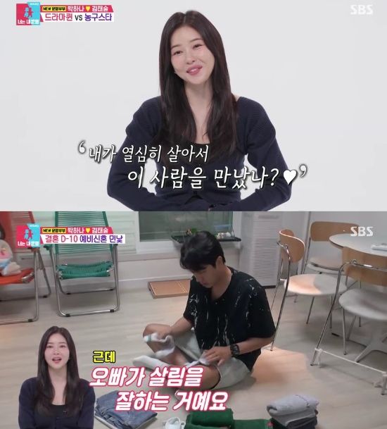 박하나는 "이 남자가 너무 사랑스러운 거다. 운동선수에 대해 무뚝뚝하고 남성적이라는 선입견이 있었던 것 같다. 근데 오빠가 살림을 잘하는 거다"라면서 "주변에 '운동선수 만나라. 살림 정말 잘 한다' 자랑을 할 정도"라며 김태술을 칭찬했다. 이에 농구 선배 서장훈은 "김태술이 유독 잘 한다. 다 그렇지 않다"며 '1등 신랑감' 인증을 자처했다.