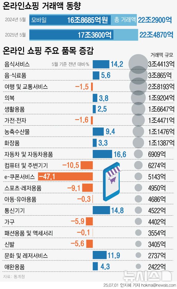 온라인쇼핑 거래액이 5월에도 소폭 늘었지만 증가세는 전달보다 둔화하는 모습을 보였다. 음식서비스와 식료품 중심의 소비는 꾸준히 증가한 반면 지난해부터 여파가 지속되고 있는 티메프(티몬·위메프) 사태의 영향으로 이쿠폰서비스는 여전히 큰 폭의 감소세를 기록했다.