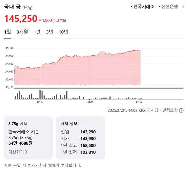 국내 금시세(금값)가 1일(한국 시각) 오후 상승세(전 거래일 대비)를 보이고 있다.