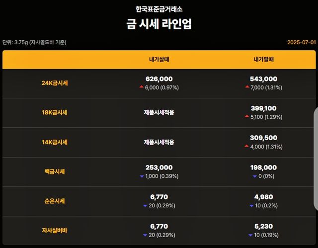 순금(24K) : 매입가 62만 7000원 / 매도가 54만 2000원