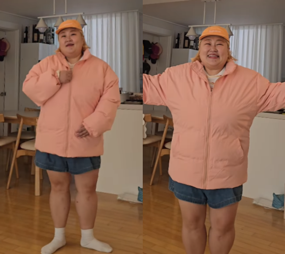 공개된 영상에는 한여름에 분홍색 패딩을 입고 있는 홍윤화의 모습이 담겼으며, '아내가 2년 전에 산 잠바를 꺼낸 이유!'라고 적혀 있어 눈길을 끈다.