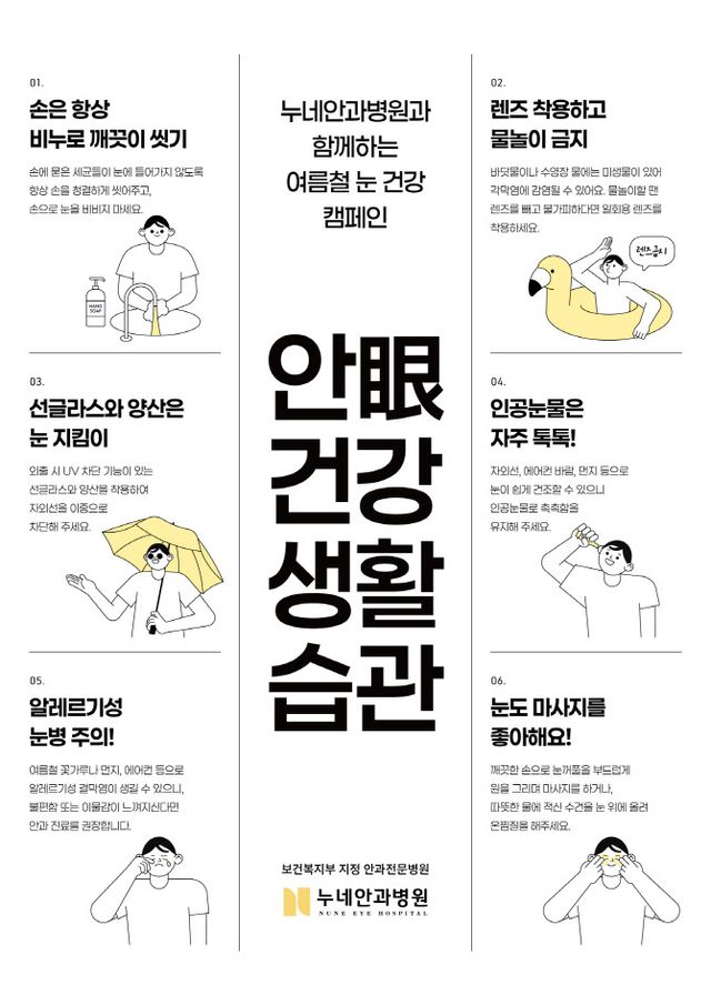 이에 따라 누네안과병원은 여름철 자외선으로 인한 눈 건강 악화를 예방하고, 올바른 관리 습관을 알리기 위한 캠페인을 진행하고 있다. 이 캠페인에서는 일상 속 실천할 수 있는 자외선 차단 방법을 안내하며, 자외선으로부터 눈을 보호하는 실질적인 실천을 독려하고 있다.