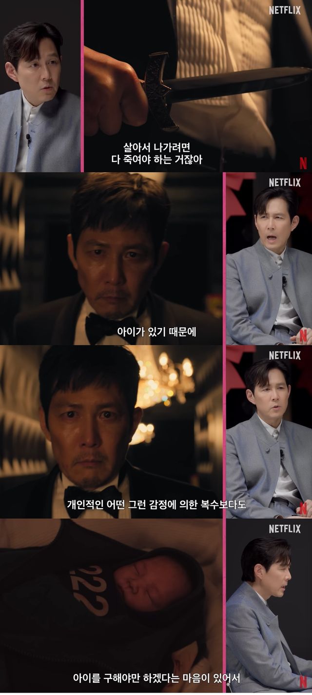 이정재는 "칼을 들고 나갈 때만큼은 아이가 있기 때문에 개인적인 감정과 복수보다 아이를 구해야만 하겠다는 마음이 있어 칼을 들고 돌아나가지 않았을까 싶다"며 당시 연기를 하던 감정을 전했다.