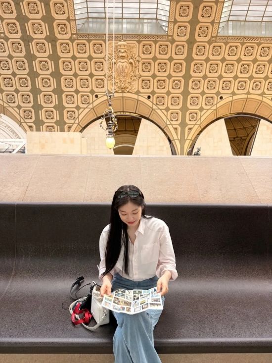 또 다른 사진에서는 센강 다리 위에서 환한 미소를 짓는 모습과, 박물관 벤치에 앉아 관광지 브로셔를 펼쳐보는 모습도 담겨 관심을 모았다. 꾸밈없는 자연스러운 매력과 우아한 분위기가 돋보인다.