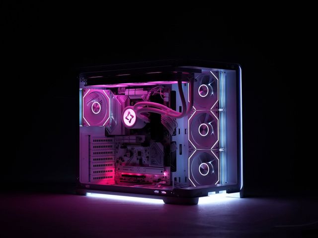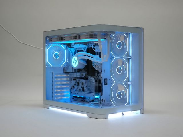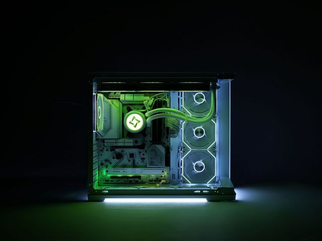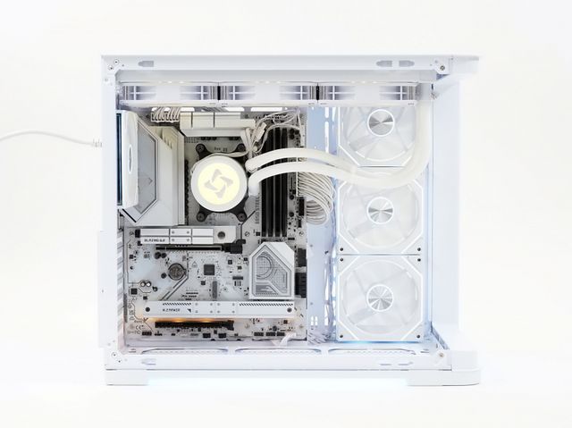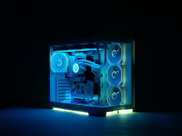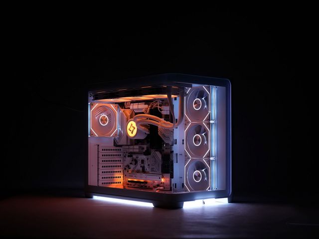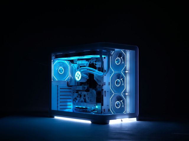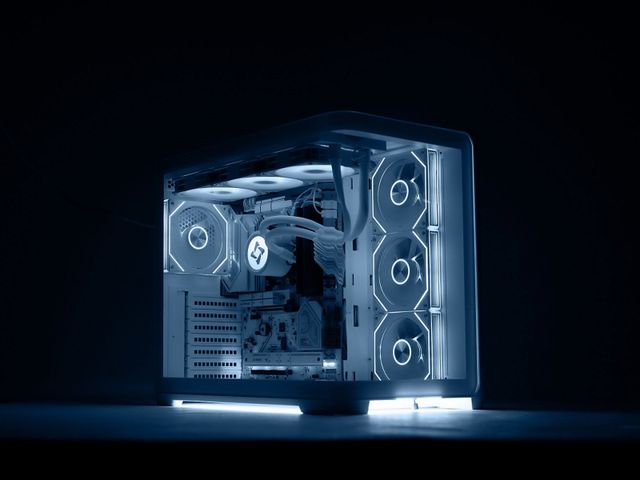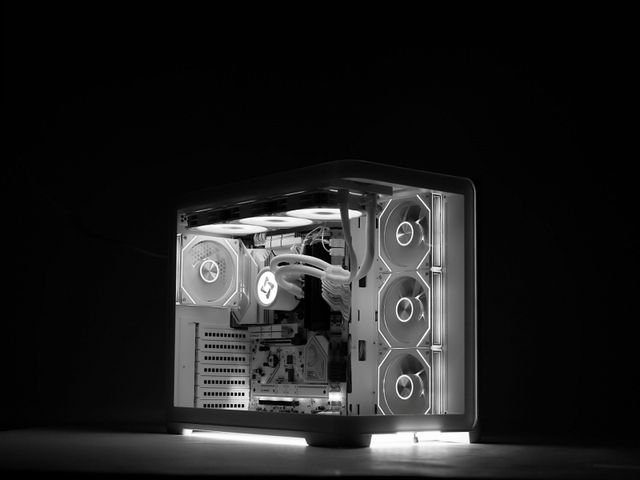 하지만 방의 조명이 꺼지면 곡선 유리 속에 숨겨 둔 인피니티 미러 팬이 깊이를 더해 작은 은하처럼 반짝이고, 케이스를 둘러싼 공기는 어느새 무대 조명 아래 선객석의 적막함으로 바뀐다.