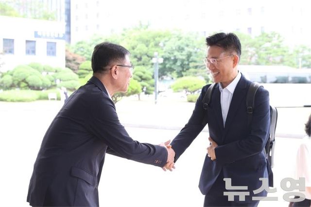 이계삼 제32대 안양시 부시장(오른쪽)이 1일 오전 8시50분경 안양시청 청사로 첫 출근을 하고 있다./사진=안양시