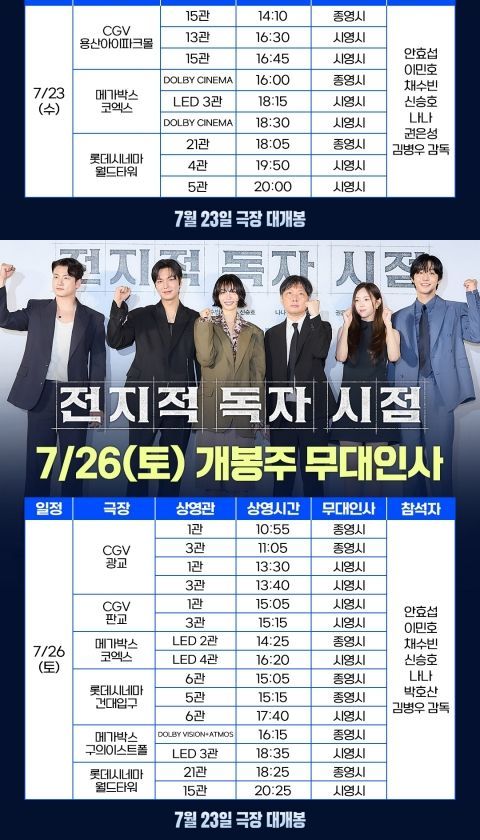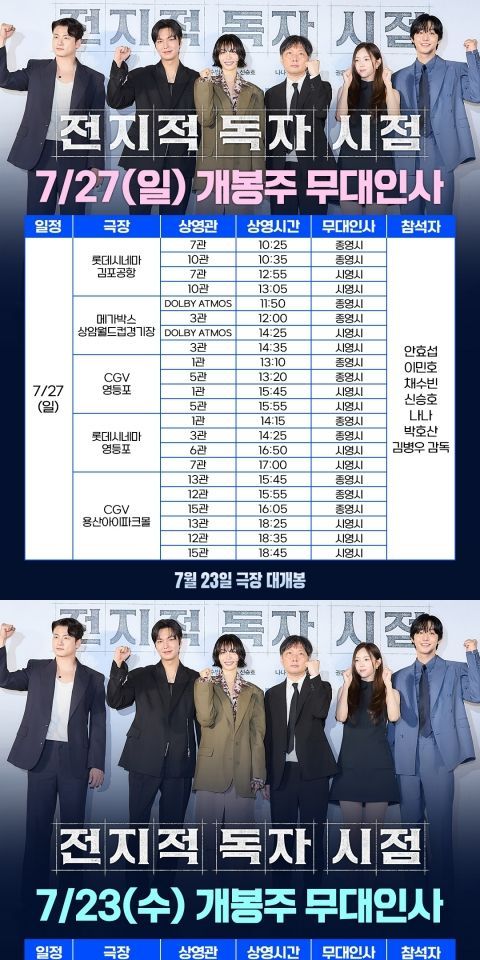 이어 7/26(토)에는 안효섭, 이민호, 채수빈, 신승호, 나나, 박호산, 김병우 감독이 무대인사에 나선다. CGV광교, CGV판교, 메가박스 코엑스, 롯데시네마 건대입구, 메가박스 구의이스트폴, 롯데시네마 월드타워를, 7/27(일)에는 안효섭, 이민호, 채수빈, 신승호, 나나, 박호산, 김병우 감독이 출격해 롯데시네마 김포공항, 메가박스 상암 월드컵경기장, CGV 영등포, 롯데시네마 영등포, CGV 용산아이파크몰에서 영화만큼이나 짜릿한 에너지를 선사할 예정이다. 영화 '전지적 독자 시점 ' 무대인사에 관한 보다 자세한 내용은 각 극장 공식 홈페이지와 어플리케이션, 롯데엔터테인먼트 공식 SNS를 통해 확인할 수 있다.