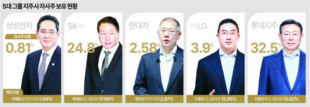 1일 업계에 따르면 5대 그룹 지주사들의 자사주 보유 비중이 늘어나고 있다. 자사주를 매입한 뒤 소각하면 전체 주식수가 줄어들면서 최대주주의 지분율이 올라가는 마법이 일어나기도 한다.