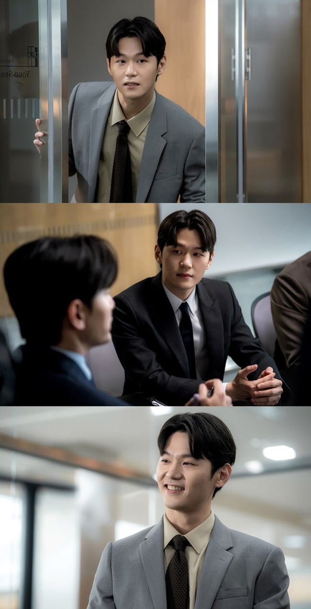 공개된 사진에서는 율림 송무팀의 듬직한 인재 이진우의 모습을 엿볼 수 있다. 조심스럽게 문을 열고 얼굴을 내미는 모습에서는 주위를 세심하게 살피는 성격이 드러난다. 또 회의 테이블에 앉아 진지하게 상사를 바라보는 순간에는 신뢰감 있는 후배의 면모가 느껴진다.