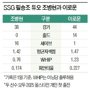 조병현과 이로운은 전반기도 마치기 전에 '동반 커리어 하이'를 달성했다. 16세이브를 기록 중인 조병현은 지난해 작성한 개인 한 시즌 최다 세이브 기록(종전 12개)을 일찌감치 경신했다. 14홀드를 챙긴 이로운도 개인 첫 두 자릿수 홀드를 넘어 순항을 이어가고 있다. 두 선수 모두 평균자책점과 이닝당 출루허용(WHIP)을 비롯한 세부 지표도 안정적이다. 베테랑 노경은·이적생 김민과 함께 필승조 라인을 단단하게 구축하니 이숭용 SSG 감독의 불펜 운영에도 계산이 선다.