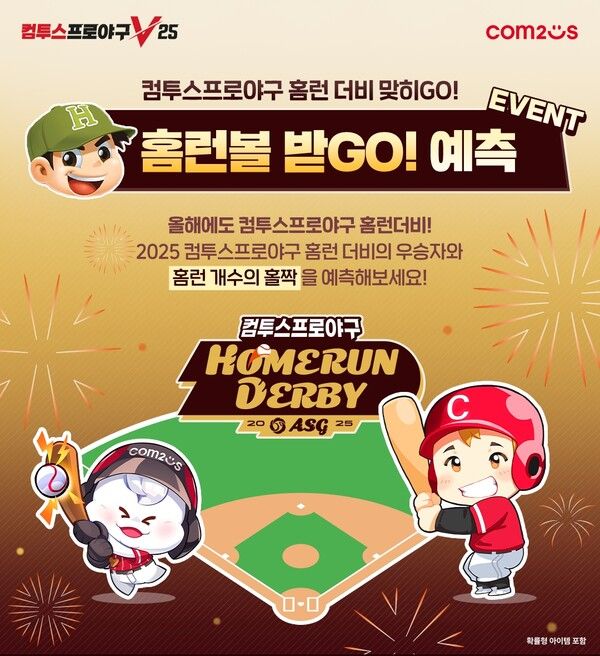 ‘컴프야V25’에서는 7월 4일부터 홈런더비 예측 이벤트를 진행한다. 공식 커뮤니티에서 ‘홈런더비 맞히GO! 홈런볼 받GO!’ 이벤트에 참여해 ‘컴투스프로야구 홈런더비’ 우승자와 홈런 개수를 조건에 맞게 예측하면 ‘라이브 5성 스카우트 티켓’ 등 게임 아이템을 받을 수 있고, 추첨 통해 선정된 50명에게는 홈런볼 제품이 지급된다.