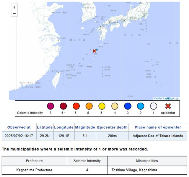 일본 기상청 누리집 등에 따르면 도카라 열도 해역에서는 이날 오전 4시 32분 규모 5.0의 지진이 발생했으며 진도 5약의 흔들림이 감지됐다.