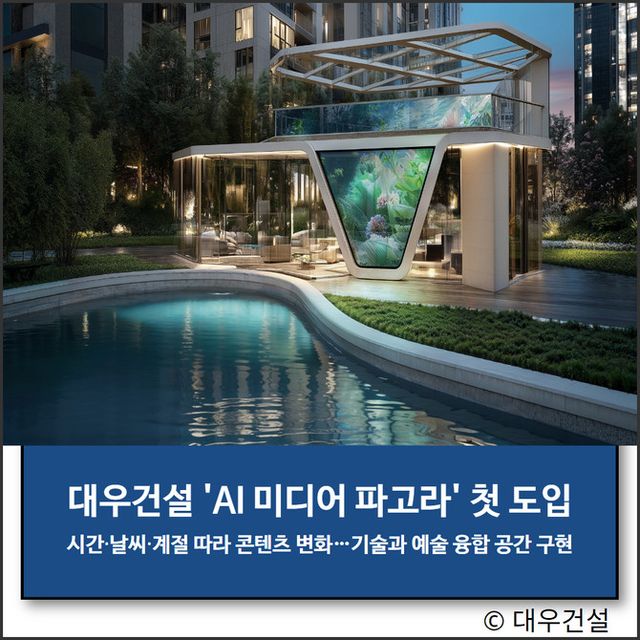 AI 미디어 파고라는 인공지능 기반 콘텐츠를 시간·날씨·계절에 따라 변화시켜 입주민 맞춤형 시각 경험을 제공한다. 대우건설은 AI 솔루션 전문기업 '플랜바이테크놀로지스', 'H3ECO'와 협업해 기술·디자인·예술 결합 공간을 구현했다.