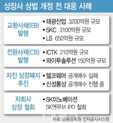 가장 눈에 띄는 움직임은 EB를 활용한 자사주 유동화다. 최대주주 입장에서는 자사주를 교환자산으로 설정할 경우 지분 희석 우려를 줄이고 현금화도 가능하다는 이점이 있다. 태광산업(003240)은 지난달 27일 이사회에서 자사주 전량(24%)을 기초로 약 3200억원 규모의 EB 발행을 결의했다. 2대 주주인 트러스톤자산운용의 반발과 금감원 정정 명령이 이어지자 태광은 후속 절차를 중단한 상태다. EB 인수자도 확정하지 않고 공시에 나섰던 만큼, 시장에서는 상법 개정이 임박한 상황에서 급하게 결정한 것으로 해석하고 있다.
