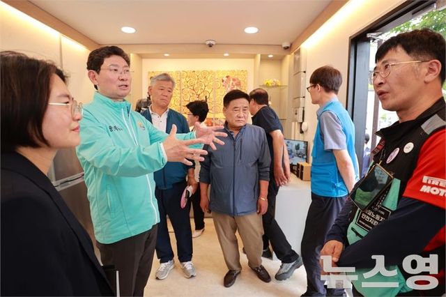 기흥구 이동노동자쉼터에서 이상일 시장이 참석자들과 쉼터를 둘러보고 있다./사진=용인시
