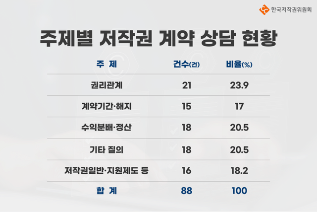 지난해 7월 시작 이후 2025년 6월까지 총 43명의 창작자를 대상으로 88건의 저작권 계약 상담이 진행됐다. 주요 상담 내용은 권리관계, 계약 기간과 해지, 수익분배 및 정산 등 저작권 계약서 전반이다. 특히 독소조항 존재 여부, 보완이 필요한 조항뿐 아니라 일반적인 저작권 지원제도 등도 꼼꼼히 검토해 작가들의 실질적인 권리 보호를 지원했다.