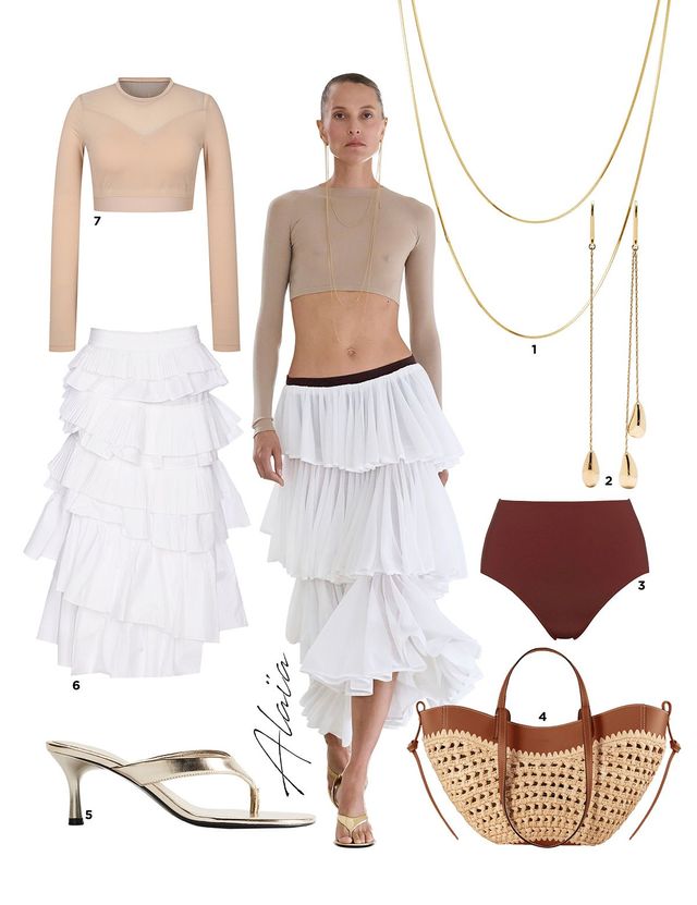 1 레이어드 체인 목걸이는 16만원대 Shift&. 2 드롭 귀고리는 24만원대 Isabel Marant. 3 브리프는 29만원대 Eres by Farfetch. 4 라피아 크로셰 가방은 63만원 Polène. 5 플립플롭 샌들 힐은 3만원대 H&M. 6 티어드 롱스커트는 37만원대 Essentiel Antwerp. 7 크롭트 톱은 10만원대 Taylor Made.