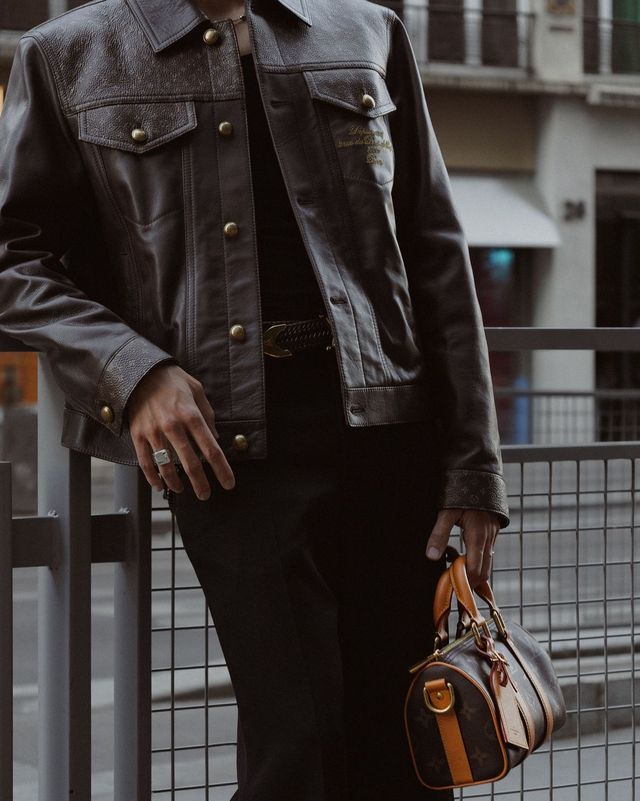 브라운 컬러 가죽 재킷과 블랙 플레어 핏 팬츠, 그리고 손끝에 무심하게 들고있는 루이 비통 미니 백은 그 자체로 시선을 집중시켰다. 고급스러운 질감의 가죽 재질은 로꼬의 개성을 한층 더 돋보이게 만들었다.