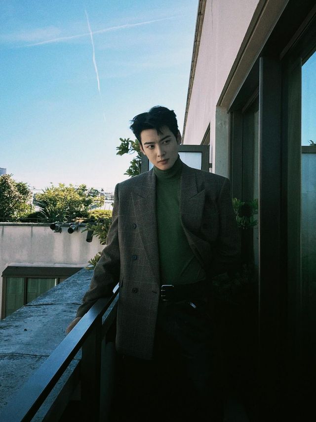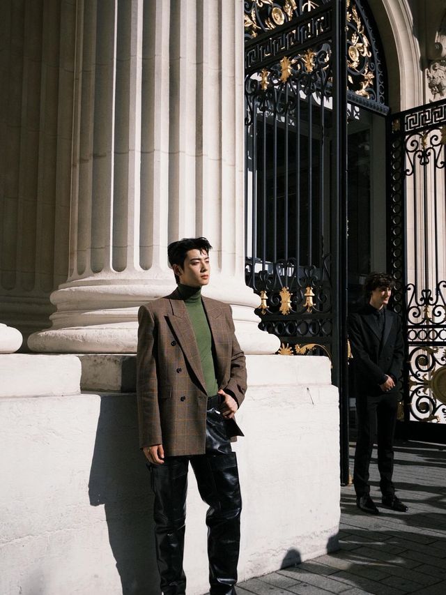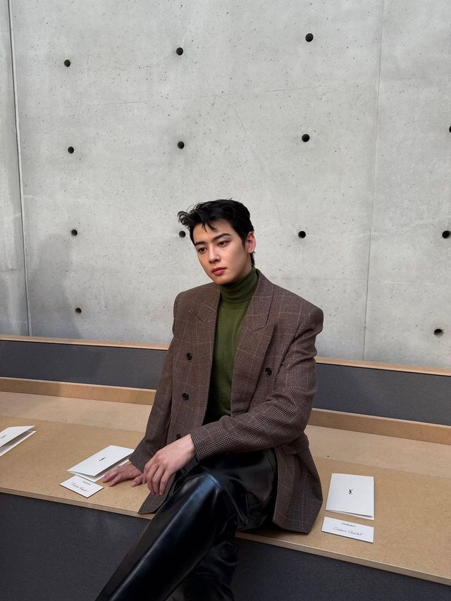 ‘최최차차’ 차은우는 이번에도 완벽한 외모로 파리를 사로잡았다. 상의는 카키색 터틀넥과 브라운 체크 재킷으로 담백하게, 하의는 가죽 팬츠와 동일한 소재의 사이하이 부츠를 섹시하게 매치하며 예상 밖의 강렬함을 더했다.