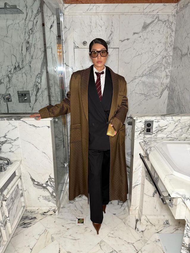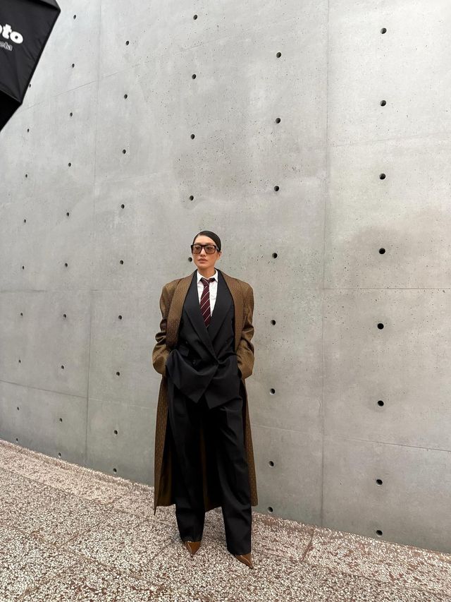 페기 구는 지난 겨울 트렌드로 자리 잡았던 생 로랑 ‘르 스모킹 룩’을 선보였다. 느슨하게 흐르는 박시한 재킷과 브라운 컬러에 패턴이 가미된 코트를 매치해 시크하면서도 여유로운 실루엣을 완성했다. 특히 틴티드 선글라스를 통해 비치는 단단한 눈빛은 페기 구 특유의 도시적이고 당당한 아우라를 더욱 돋보이게 했다.