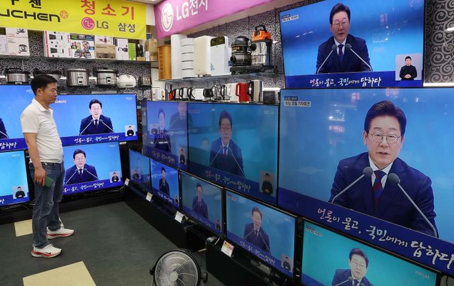 3일 서울 용산구 전자랜드 매장에서 상인이 '대통령의 30일, 언론이 묻고 국민에게 답하다'라는 이재명 대통령 기자회견을 보고 있다. / 뉴스1