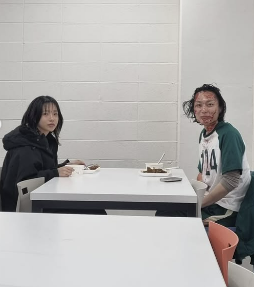 공개된 사진 속에는 조유리가 담은 ‘오징어 게임3’ 촬영 현장의 모습이 담겨있다. 특히 피투성이 분장을 한 노재원과 마주보고 식사를 하는 조유리의 당혹스러운 눈빛이 이목을 끌었다.
