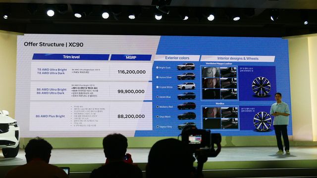 판매 트림은 ▲휠 사이즈 ▲바워스&윌킨스 하이 피델리티 사운드 시스템 ▲앞 좌석 전동 사이드 서포트 및 마사지, 통풍 시트 등 일부 편의사양의 차이에 따라 플러스(Plus)와 최상위 울트라(Ultra)로 출시된다. 울트라 트림의 경우 브라이트, 다크 외관 테마를 선택할 수 있다. XC90 B6 플러스 트림의 판매가는 8,820만 원, 에어 서스펜션이 적용된 B6 울트라 트림의 판매가는 9,990만 원이며, XC90 T8 울트라 트림의 판매가는 11,620만 원이다.