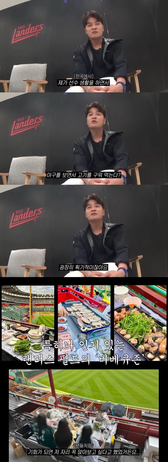 선수가 아닌 관중으로서 야구장을 찾은 추신수는 "야구를 보면서 고기를 구워 먹는다? 굉장히 획기적이다. 선수 때도 보기도 했고 '기회 되면 저 자리에 꼭 앉아보고 싶다'라고 (생각) 했었다"며 오랜 바람을 밝혔다.