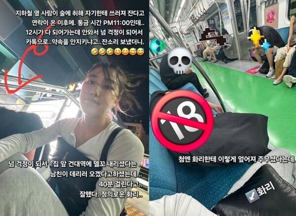 공개한 사진에는 늦은 밤 지하철 좌석에서 술에 취해 쓰러져 누워 있는 승객의 모습과, 옆자리에 앉아 상황을 살피는 홍화리의 모습이 담겼다.