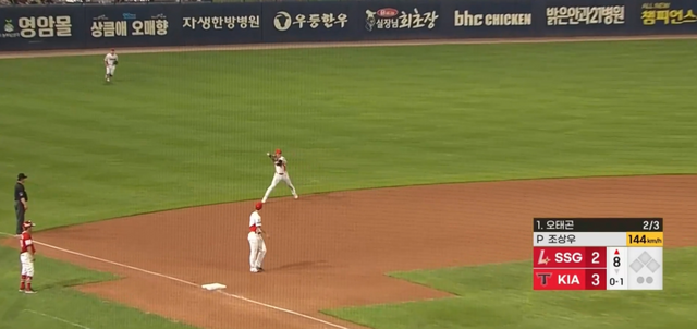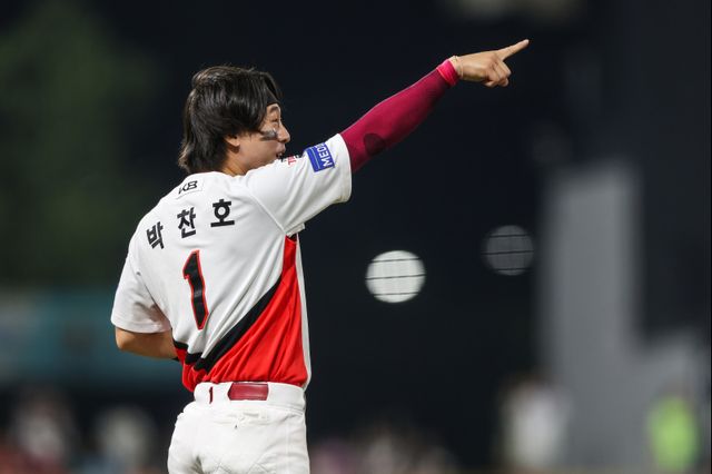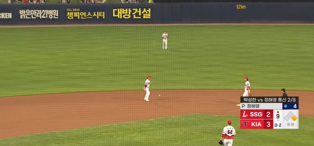 박찬호는 3-2로 앞선 8회 초 선두타자 오태곤의 유격수 방면 타구를 그림 같은 송구로 연결했다. 3루 쪽으로 치우친 까다로운 타구였는데 특유의 잔발 스텝으로 따라간 뒤 역동작으로 포구, 곧바로 1루를 향해 던졌다. 하이라이트 프로그램에 나올법한 아크로바틱한 수비. 1루수 오선우가 다리를 주욱 찢으며 원바운드 송구를 받아내 보는 이들을 두 번 놀라게 했다. SSG 벤치에서 1루 아웃 관련 비디오 판독을 신청했으나 원심(아웃)이 유지됐다.