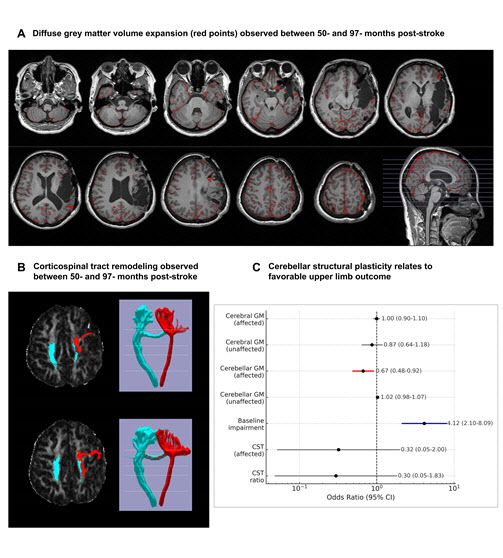 특히 병변과 연결된 소뇌측의 회백질 부피 증가가 장기적인 상지 기능 회복과 독립적인 상관관계를 보였으며, 이는 소뇌의 구조적 가소성이 만성기 뇌졸중 환자의 운동 기능 회복의 핵심 기전임을 보여주는 결과다.