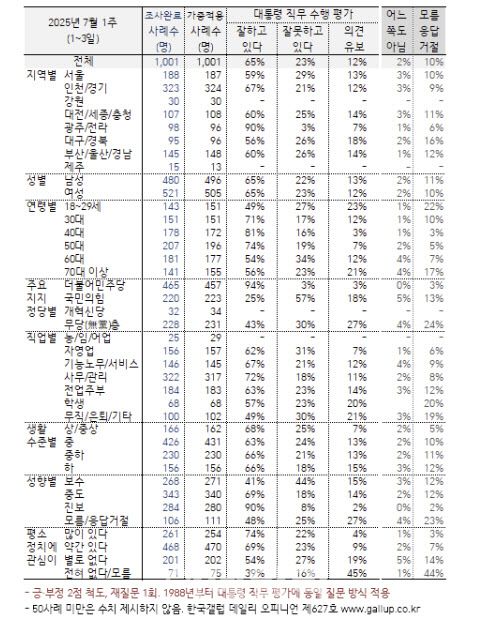 이번 조사는 7월 1일부터 3일까지 사흘간 이동통신 3사가 제공한 무선전화 가상번호를 무작위로 추출해 전화조사원이 직접 응답을 받는 방식으로 진행됐다. 응답률은 12.1%, 표본오차는 95% 신뢰 수준에서 ±3.1%포인트다. 여론조사 결과의 자세한 내용은 한국갤럽과 중앙선거여론조사심의위원회 누리집을 참조하면 된다.