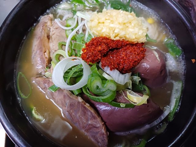 구수한 사골 육수, 넉넉히 들어간 소뼈, 하나하나 큼직한 선지에 시원한 배추까지! 빈틈없이 가득 찬 뚝배기의 펄펄 끓어오르는 소리만으로도 지친 이들에게는 위로이고 응원이다. 넘쳐흐르는 국물에 봉긋 솟아오른 건더기를 바라보며, 오늘도 부지런히 시작했음에 만족하고 기운찬 첫 숟가락으로 식사를 시작한다.